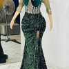 Jewel Mermaid Lace Applique Sequined Floor-length Half Sleeves High Split Prom Dress