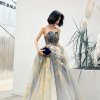 Yellow tulle lace long prom dress, yellow tulle lace formal dress